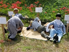 今回の案山子祭りのテーマは「不倫・問題」とのことで年寄り案山子どうしの不倫の様子らしかった(?) |